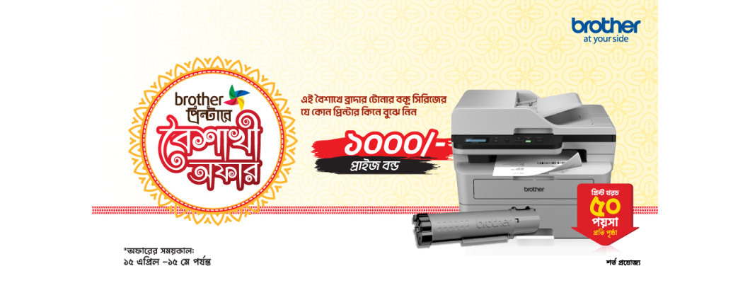 নতুন বছরের নতুন আনন্দে ভরিয়ে দিতে, আন্তর্জাতিক মানের প্রিন্টার ব্র্যান্ড ব্রাদার নিয়ে এসেছে একটি চমকপ্রদ অফার। বাংলা ১৪৩২ সালকে স্বাগত জানিয়ে ব্রাদার ঘোষণা করেছে এক বিশেষ ক্যাম্পেইন — "ব্রাদার প্রিন্টারে বৈশাখী অফার"। এই অফারের আওতায় গ্রাহকরা পাচ্ছেন নিশ্চিত পুরস্কার এবং প্রিন্টিং খরচে সাশ্রয়ের দুর্দান্ত সুযোগ।