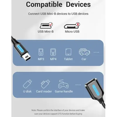 | Additional Info | Brand: Vention Name: USB Mini-B Male to A Female OTG Cable Model: CCTBB Color: Black Interface: USB 2.0 Mini-B Male/USB 2.0-A Female Interface Technics: Nickel-plated Transmission Speed: 480Mbps Conductor: Tinned-copper Shell: PVC Shielding: Aluminum Foil + GND Jacket: PVC AWG: 24+28AWG OD: 4.0mm Length: 0.15m Warranty: 1 Year Packing: PE Bag 01-Year Brand Warranty |